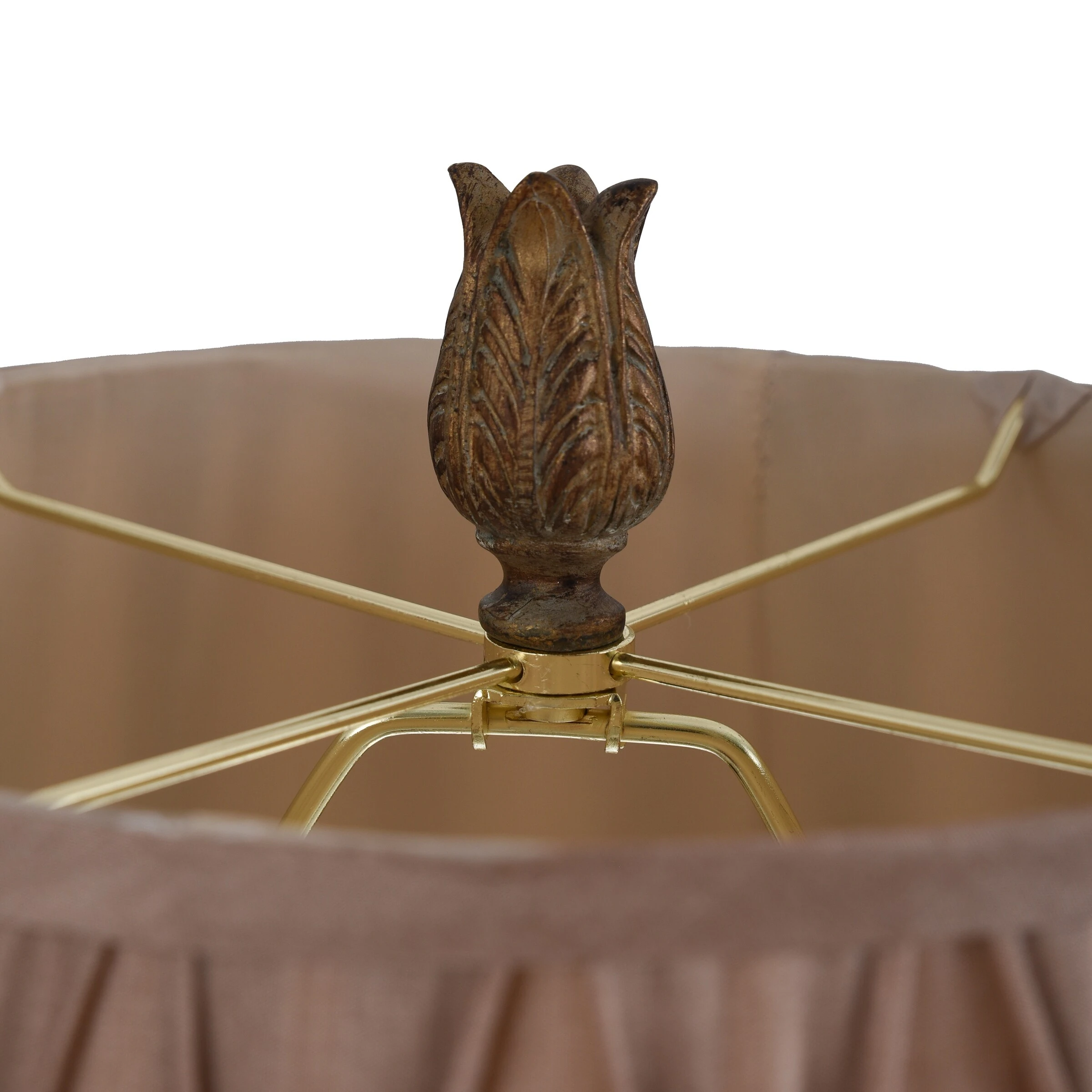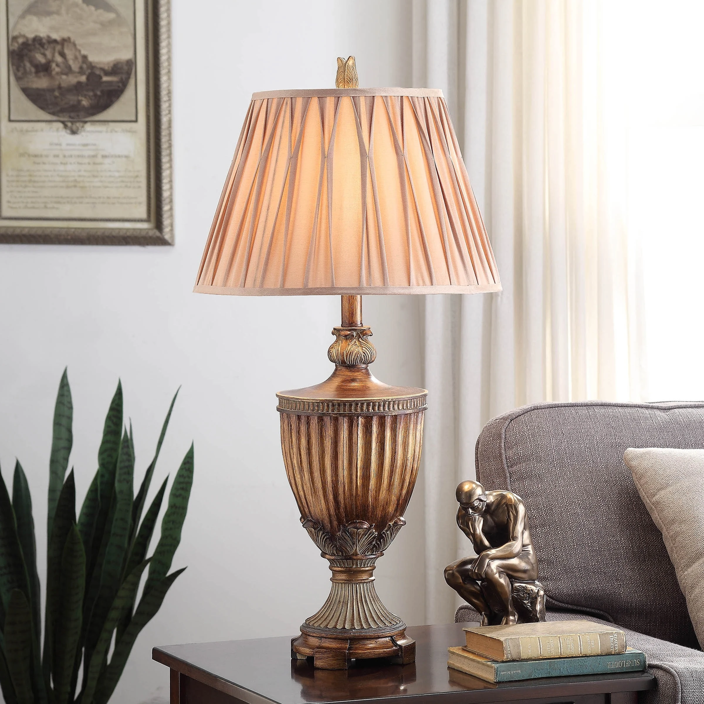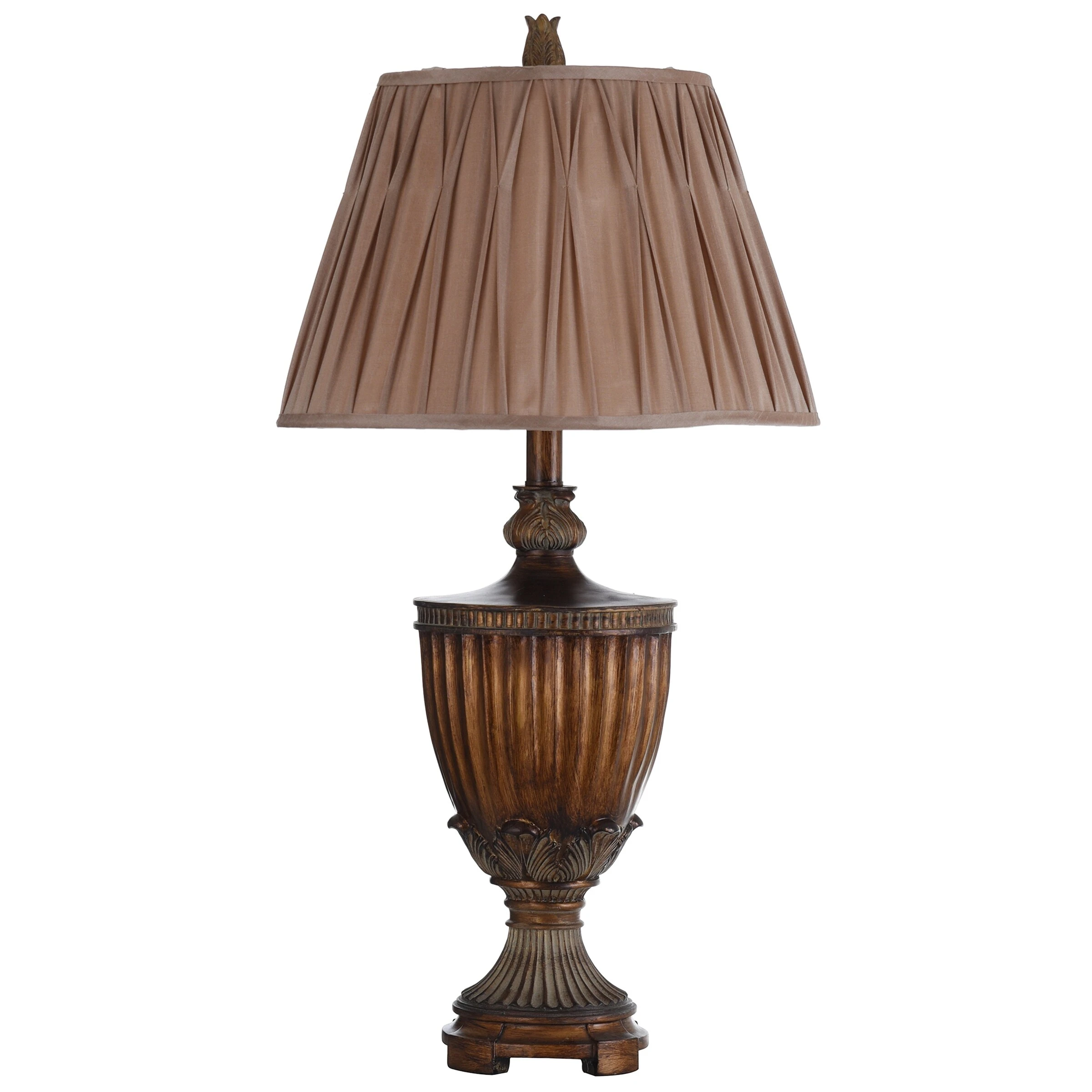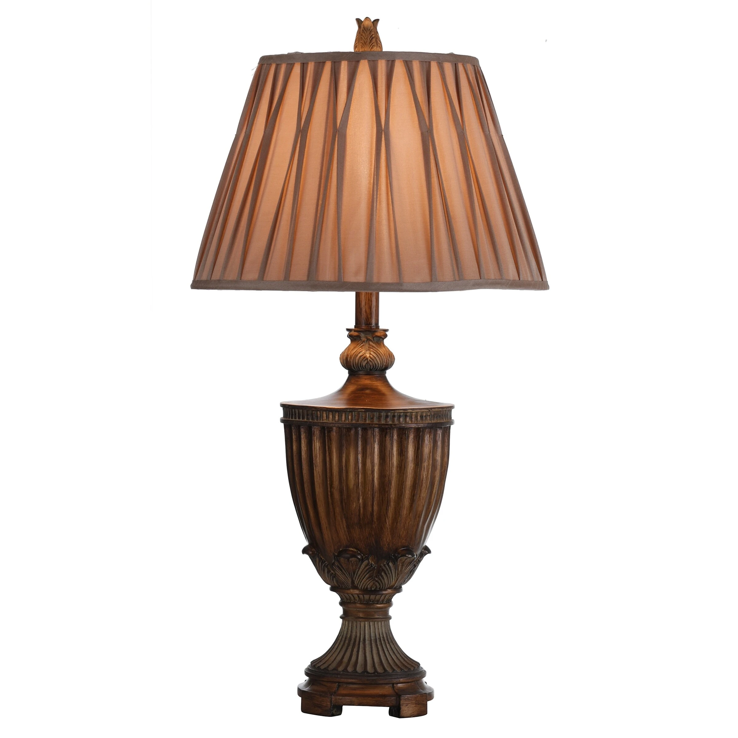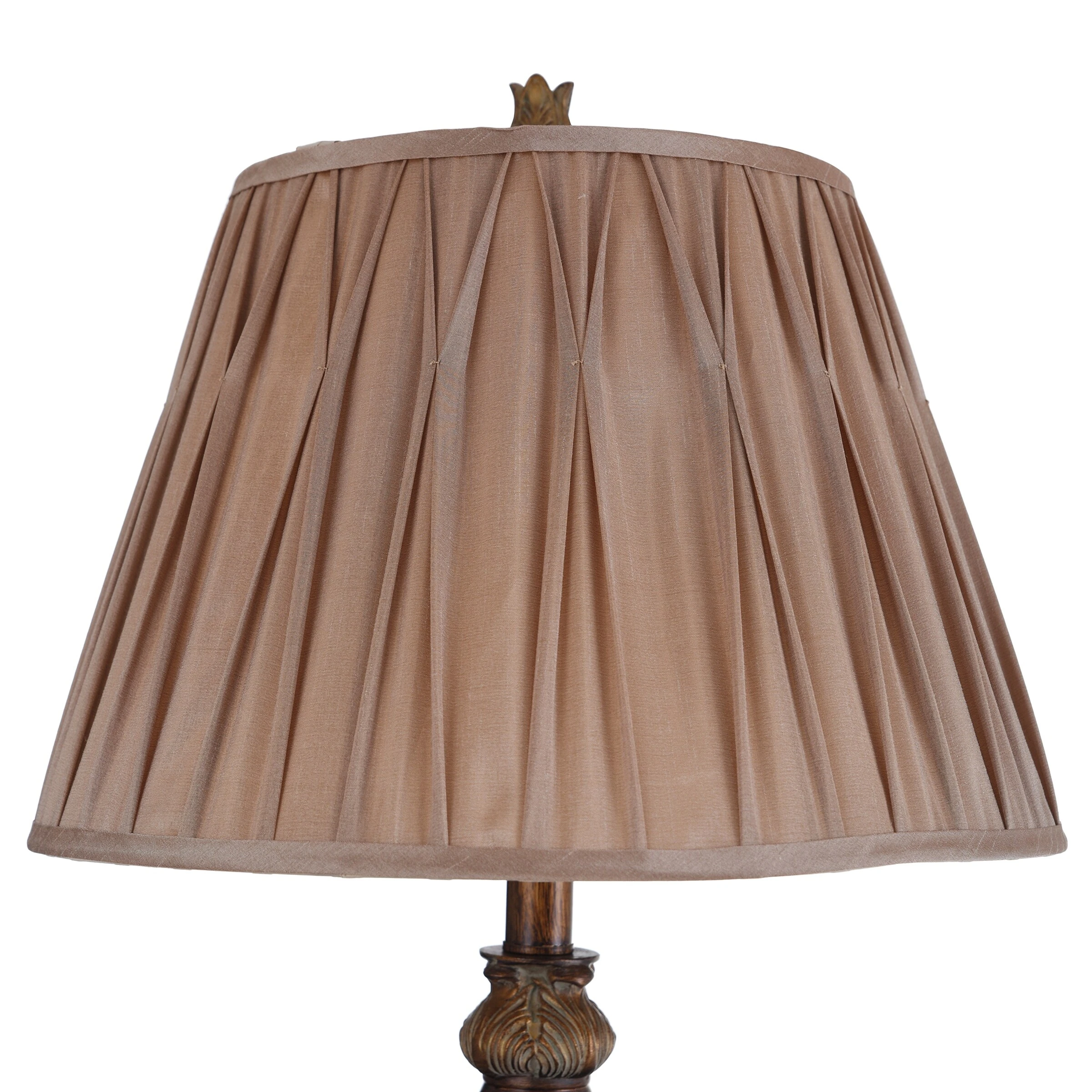With a bronze finish that highlights every detail of the elaborate frame and finial, this table lamp is sure to be the focal point of any office desk or bedroom nightstand. The beige softback fabric shade has pleats that further enhance the elegant look of this lamp. Accentuate a side table in a living room, hallway, or dining room with this stunning bronze table lamp.