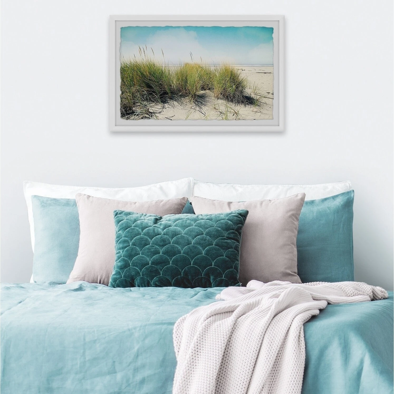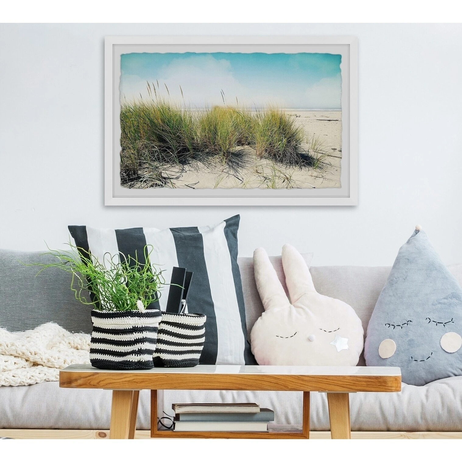 Take a trip to the beach without even going anywhere, with some help from this gorgeous piece of wall art. Framed in a quality warp-resistant wood frame and boasting vivid hues of blue, beige, green, and others, this art offers you a welcome respite from a hard day’s work.