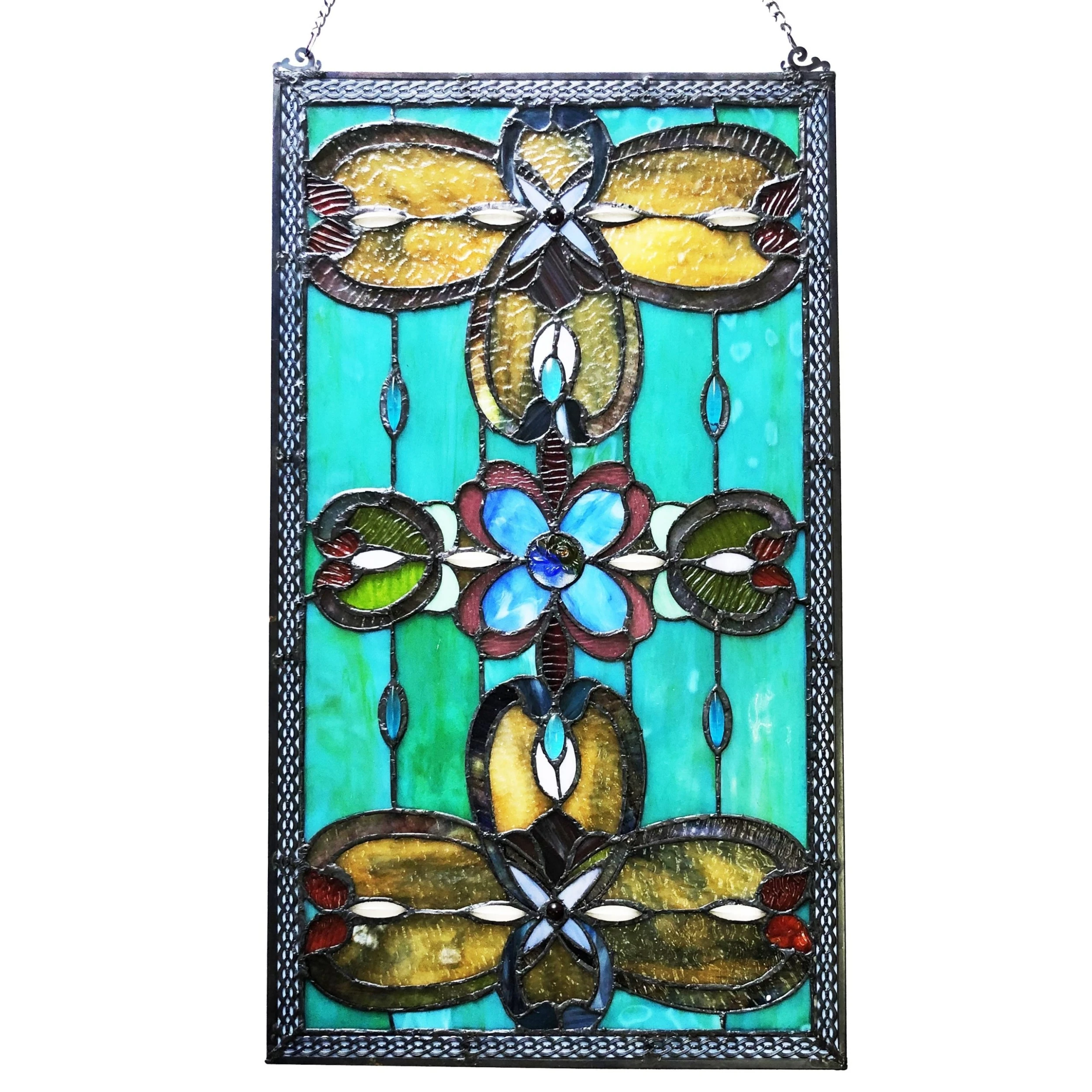 With a striking aquamarine palette accented with pops of bright cherry red, beige, and sage green, this Victorian-style window panel will add color and beauty to any room. Crafted from 172 hand-cut pieces of art glass and seventeen glass beads. This window panel delivers shades of teal which will brighten up any room.