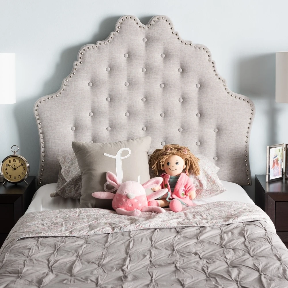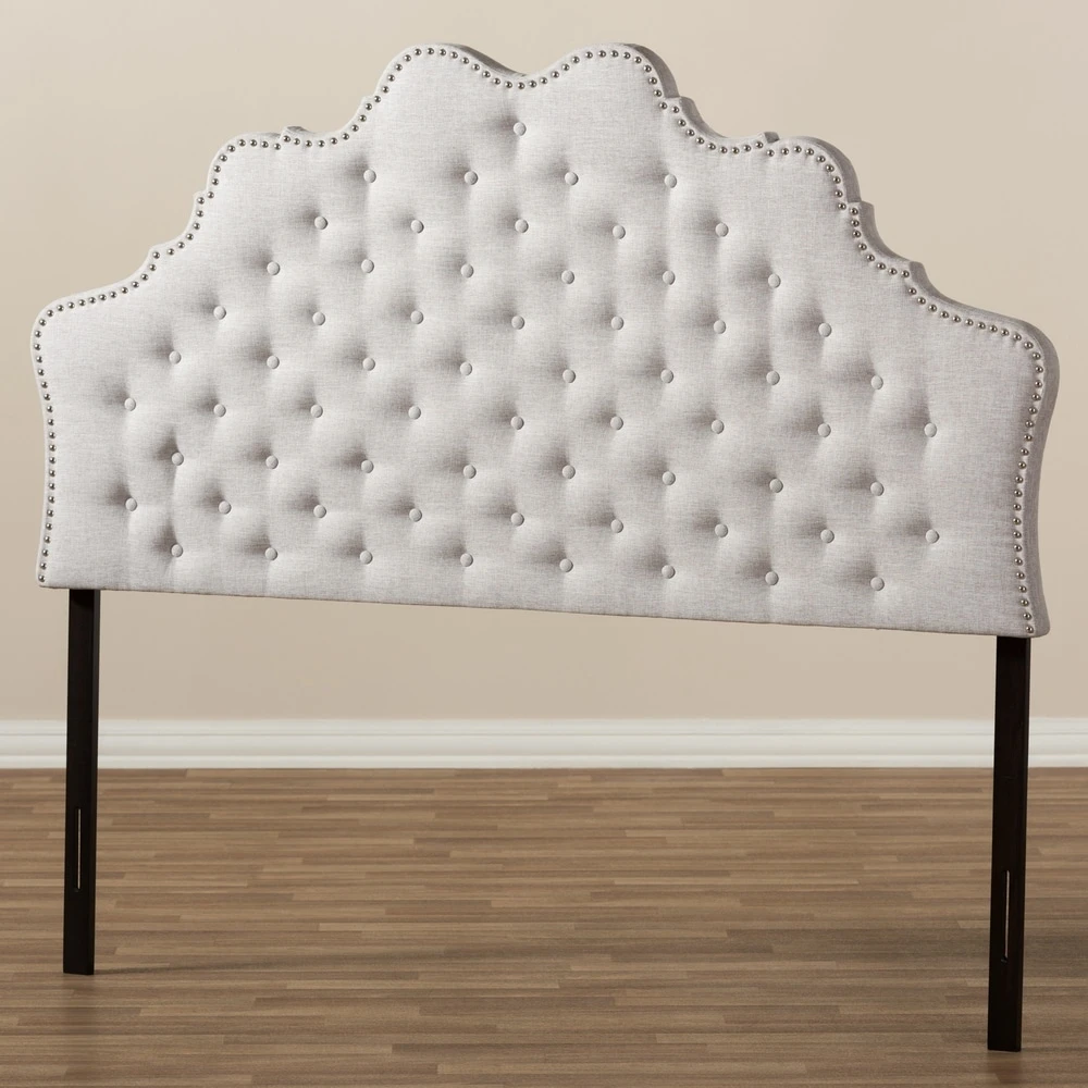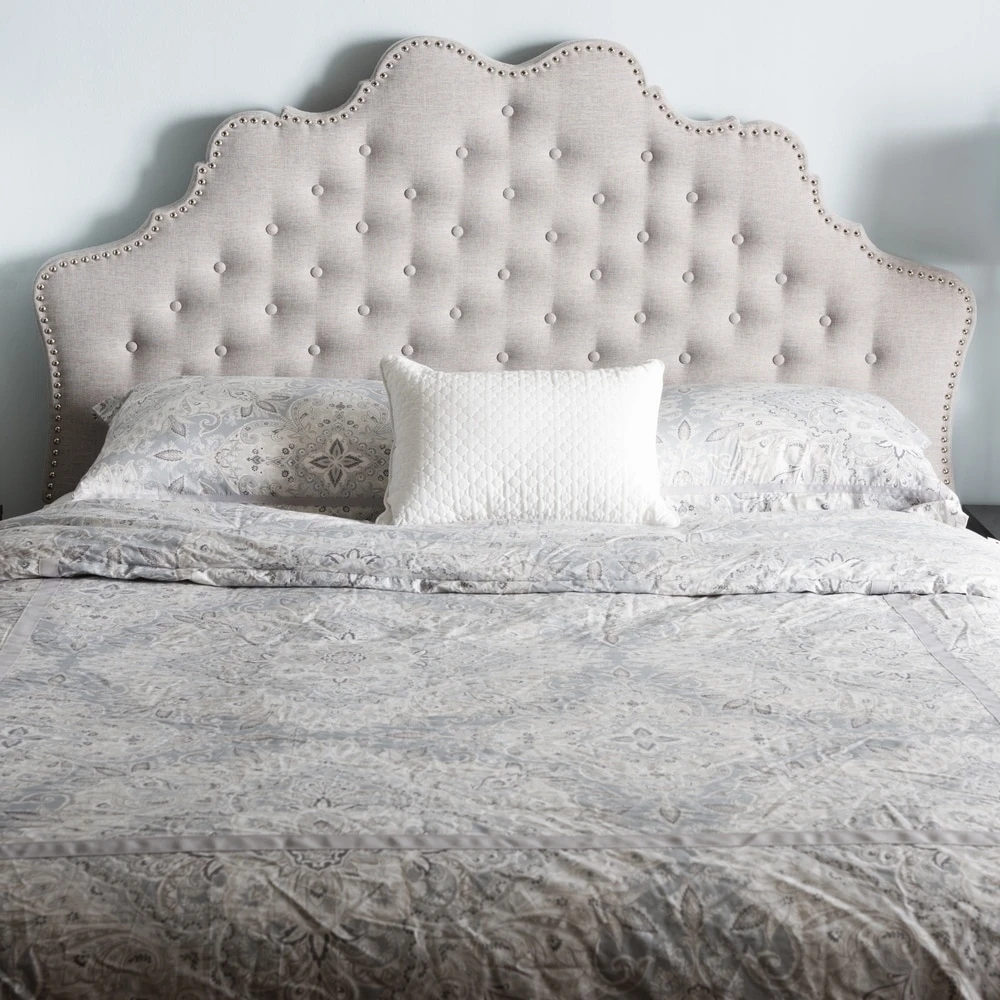 Elevate your bedroom with the luxurious elegance of this upholstered headboard. Available in a dark or light grey to match your decor, the headboard boasts button tufting and nailhead trim for a vintage, glamorous flair. Foam padding and sturdy construction ensures lasting comfort.