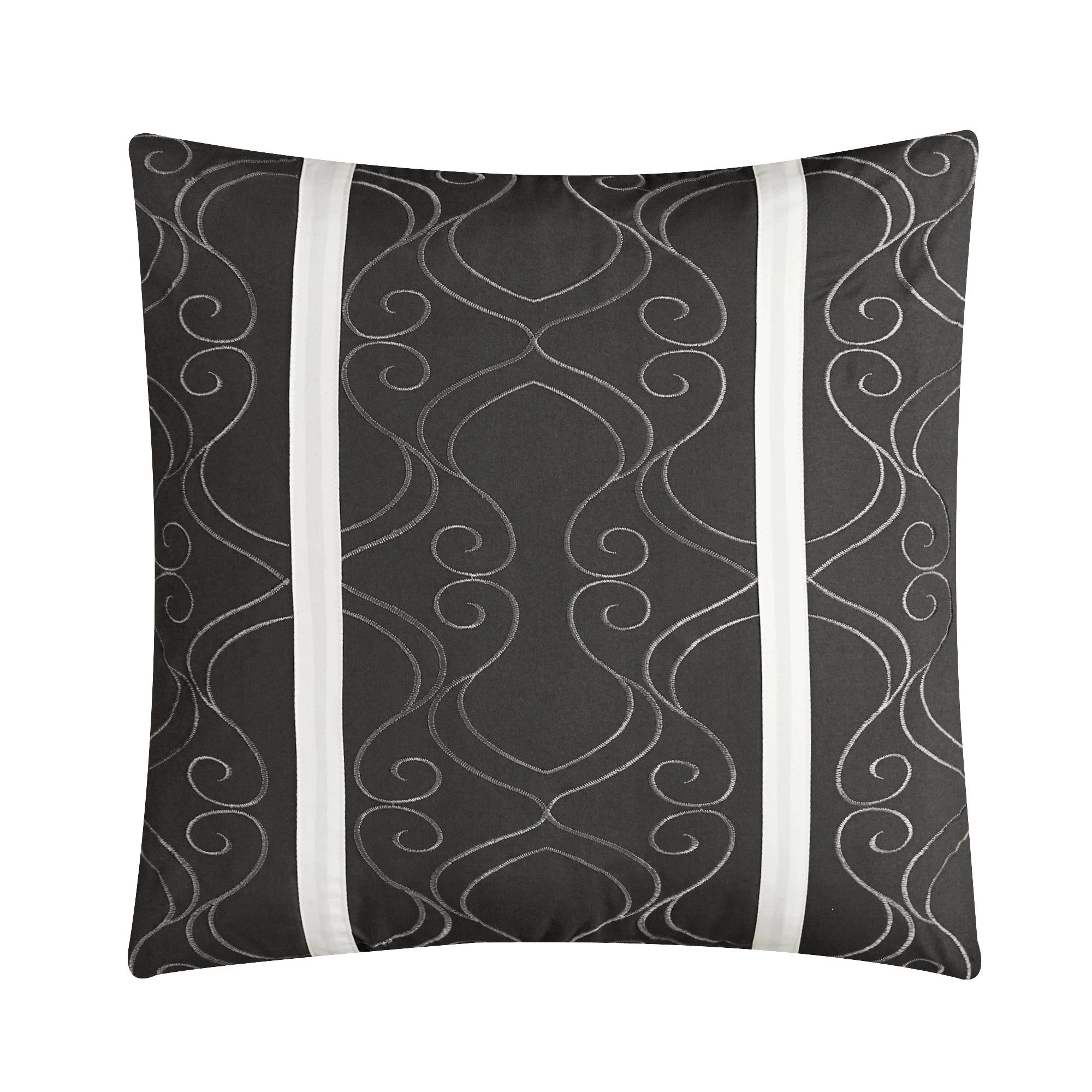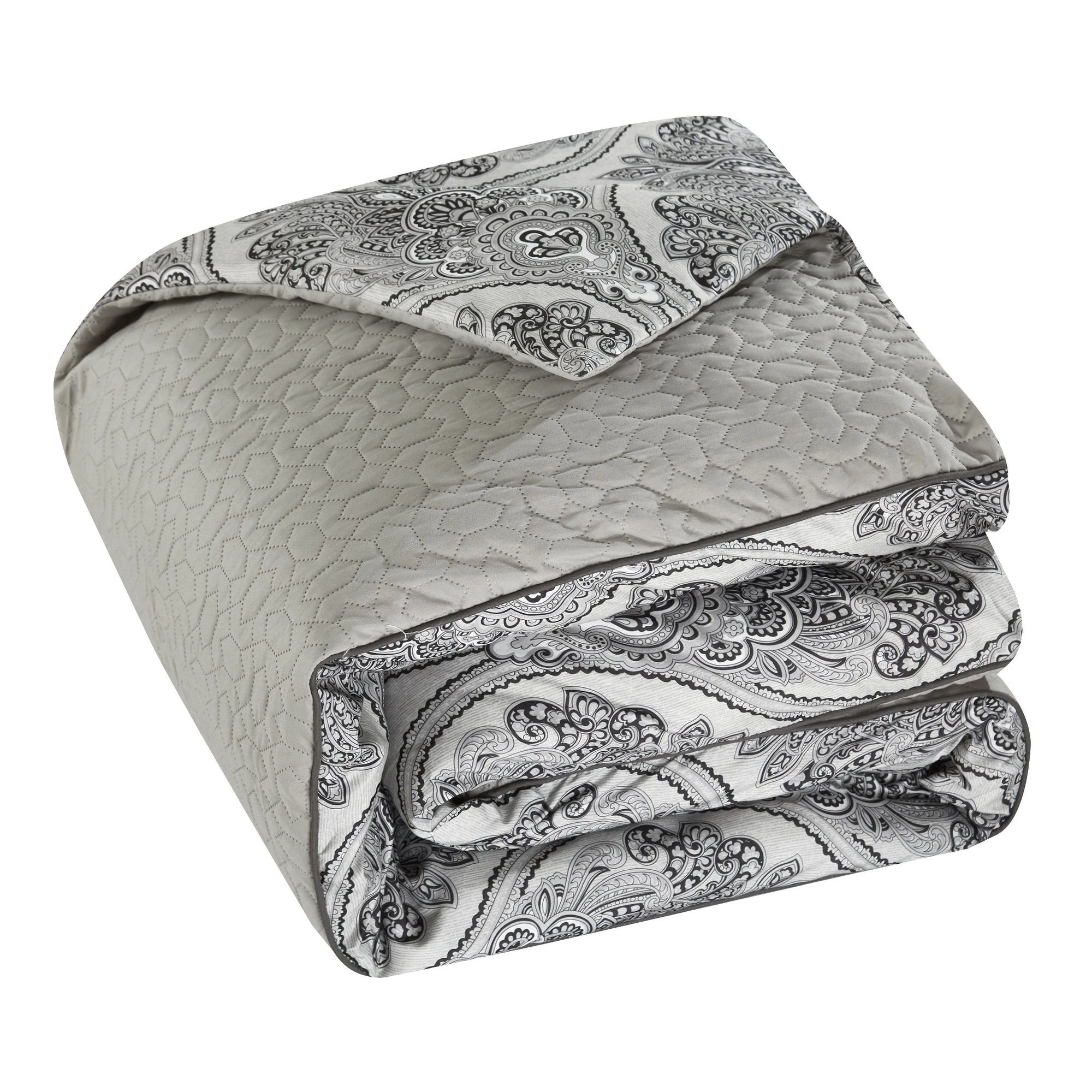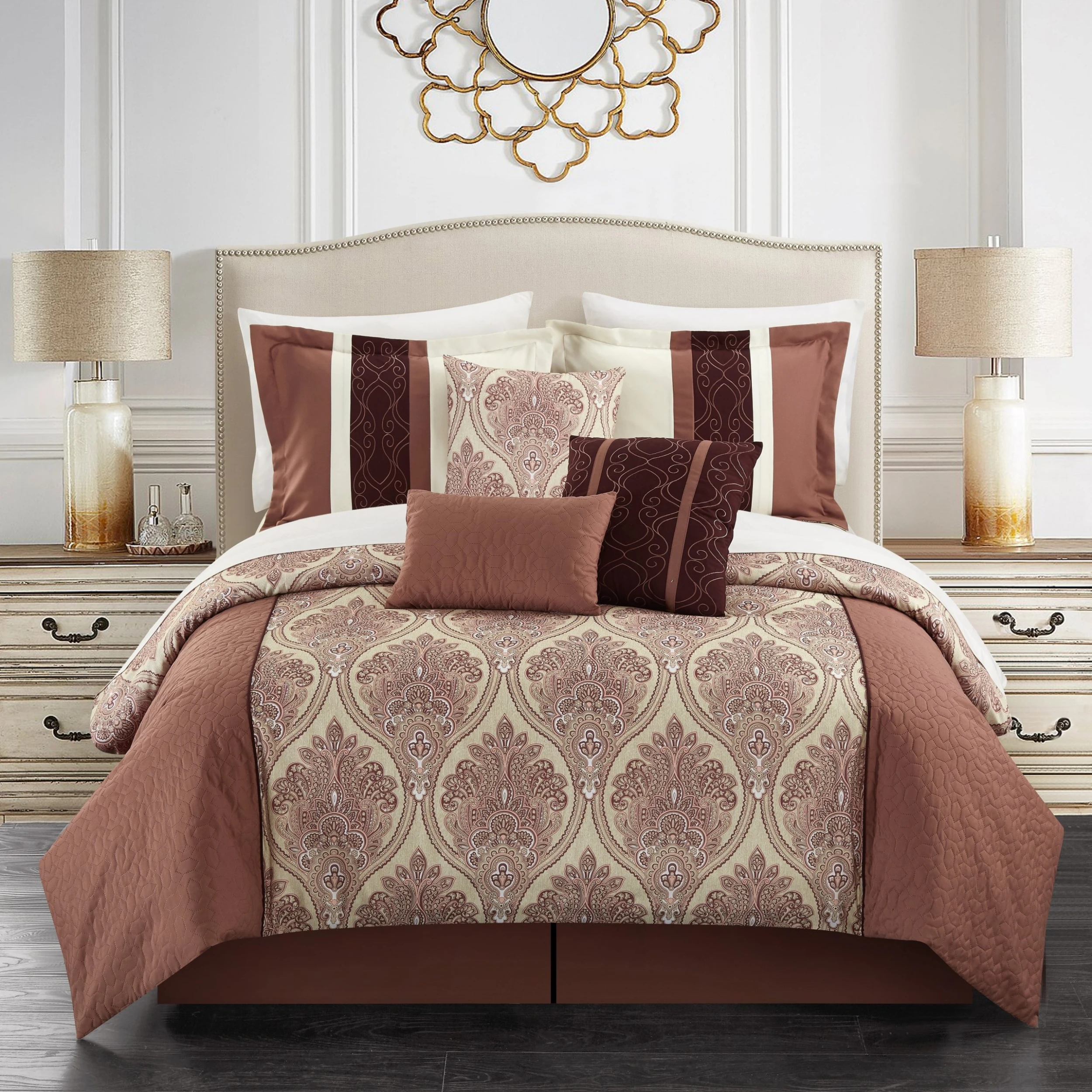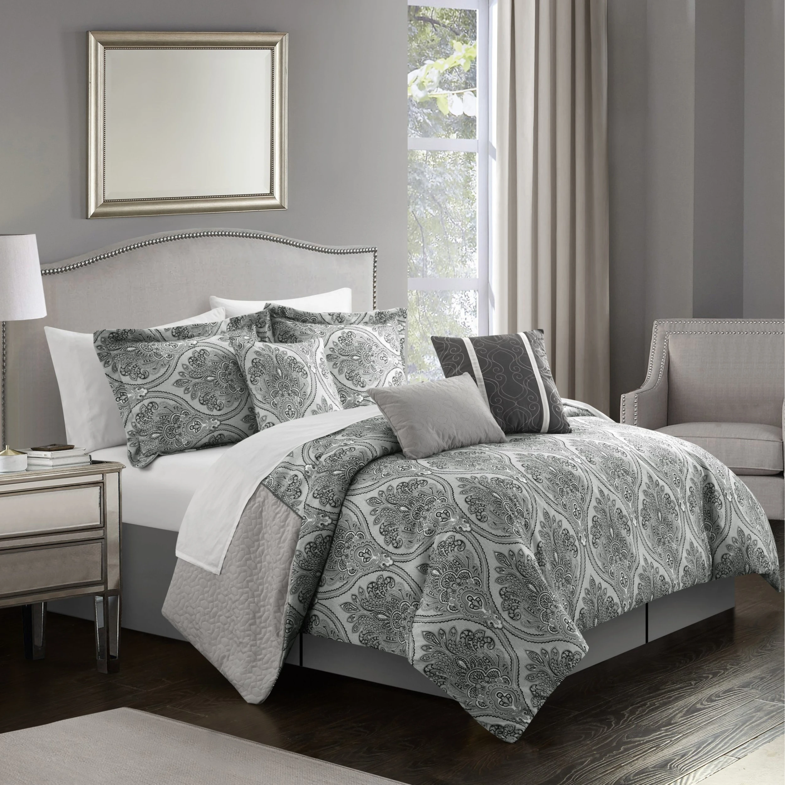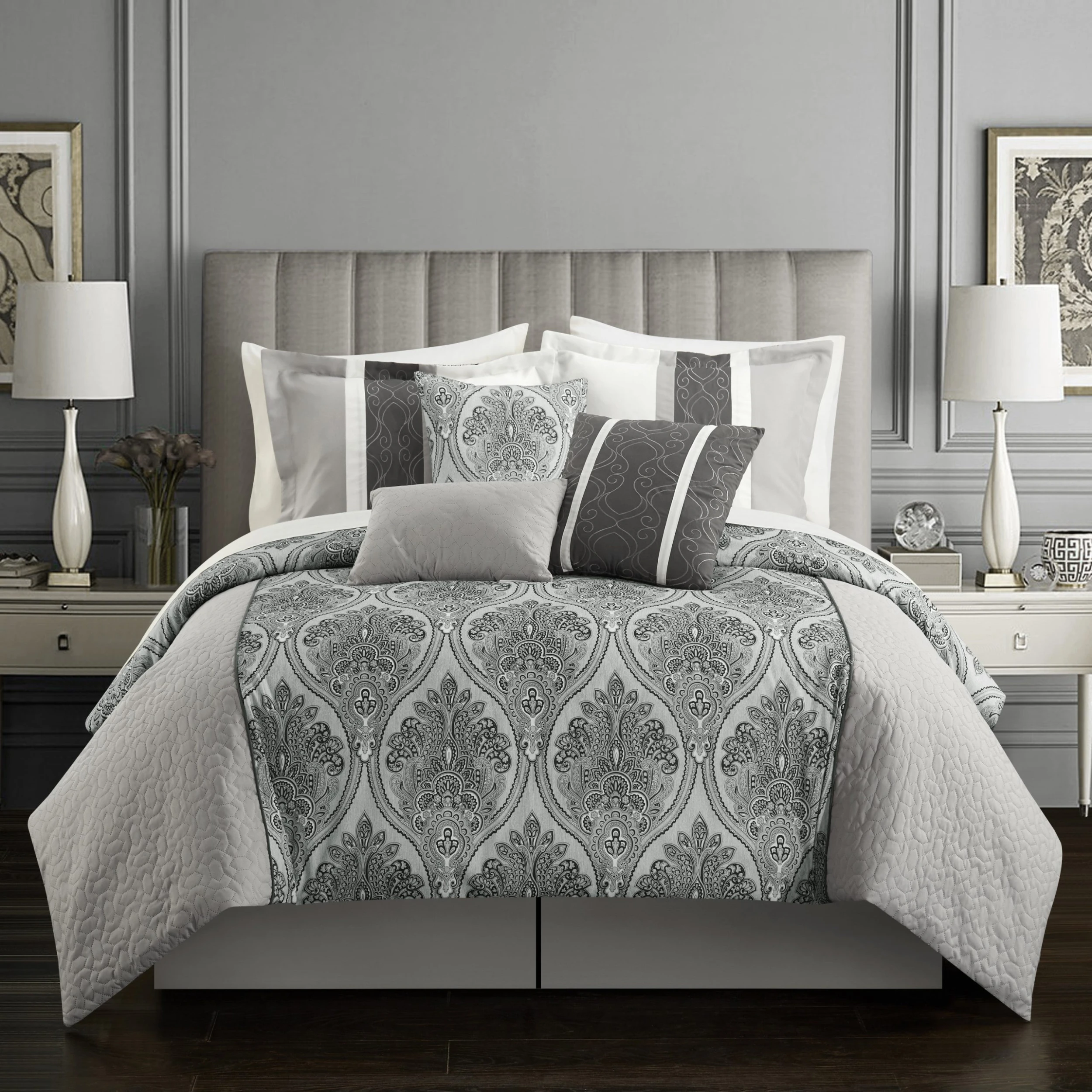Soak up the glamorous radiance emanating from this gorgeous, eleven-piece, bed-in-a-bag bedding set, for a chic, complete bedroom makeover. The reversible comforter features a damask pattern with geometric quilting on the face and a design coordinated damask pattern on the reverse. A bed skirt, coordinated shams, and embellished deco pillows all synergize for a high-end charm sure to please and to comfort.