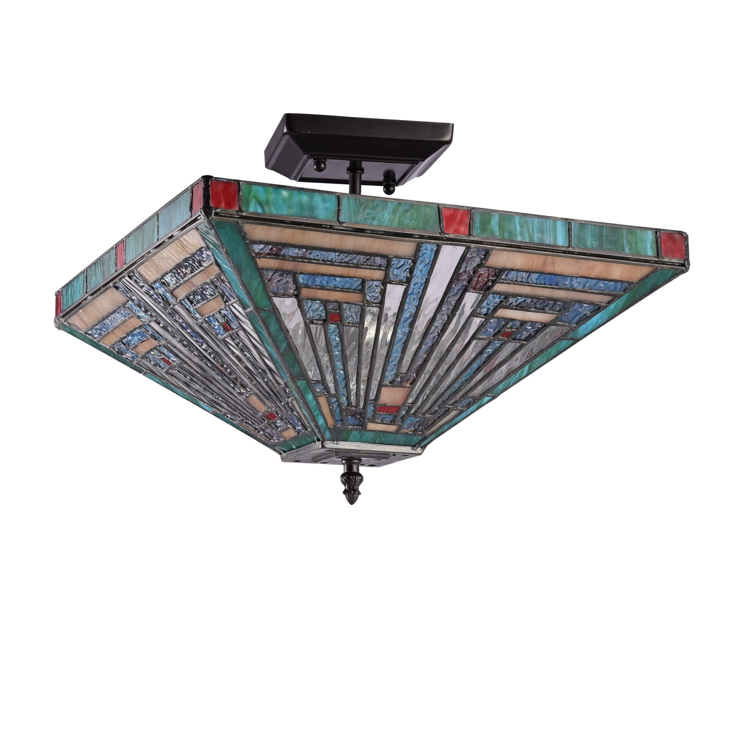 This dazzlingly modern yet playfully old-school, Tiffany-style, Mission-inspired, two-light, semi-flush fixture features a black painted finish that will complement many decors throughout your home. Crafted from 272 pieces of hand-cut art glass, this piece brings a dash of Art Deco flavor to your space, for a piece you’re sure to enjoy for years on end.
